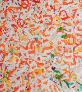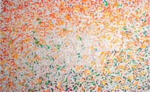Nous sommes en présence d’une composition puissante et foisonnante. Les formes curvilignes et irrégulières s’entrelacent et se superposent.